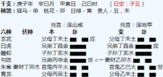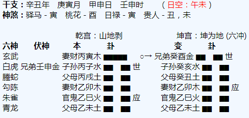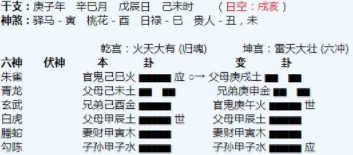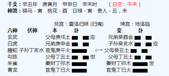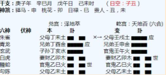 悟道解析:淮阳算命大师1、命主在辰土宫,临朱雀,官星寅木发动,动而克制辰土,木克土,显示命主目前情况不太好,来自于老公方面的压力比较大,整体的家庭财运也在变差。2、老公临青龙发动,青龙主酒色财气,显...