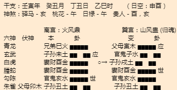 悟道解析:鹿邑算命大师1、命主主卦火风鼎卦,这是一个丰收的卦象,代表稳中有进的意思,变卦山风蛊,有点吉中带凶,需要防范小人捣鬼。2、命主的世身和官星在亥水宫,临勾陈,比较稳,职位和位置都比较稳定,而...