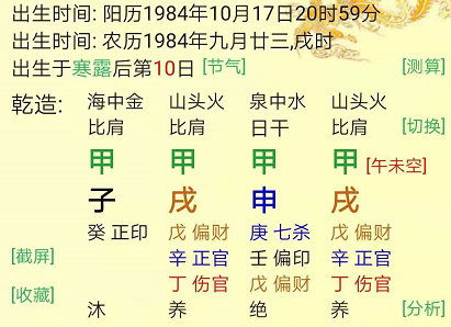 悟道分析:赤水算命大师一、八字格局用神分析1、日干甲木生于季秋九月戌土偏财当令,为偏财格,日支申金七杀落主位,时上又一戌土偏财,日元甲木无根,年支子水远水不解近渴,尽管天干四透甲木比肩,但各自无根无...