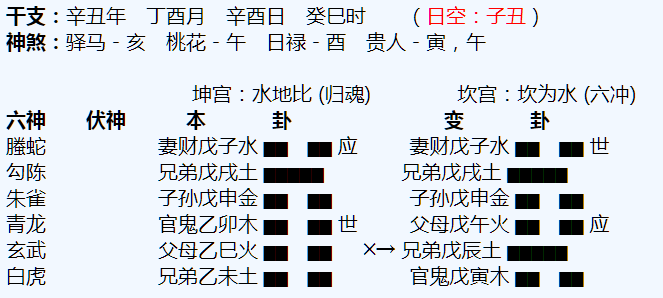 悟道分析:溪湖算命大师1、八字上看今年你是三支犯太岁,而且正印被冲了,所以运气差,流年出问题。当然疫情原因是大因果,您自己的八字也流年不顺,因此受到的影响会大一些。2、命主卦上巳火临玄武发动,动化辰...
