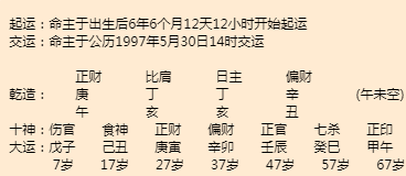 悟道解析:汪清算命大师一、八字命局综合分析:1、命中财星很旺,而且还带偏财,偏财通门户,是个发财的命。而且赚钱发财也不会很累,一旦发达的时候,发财发得比较大,也发得比较快。2、要注意时柱庚辰,比肩带...
