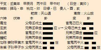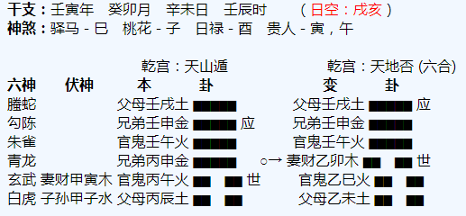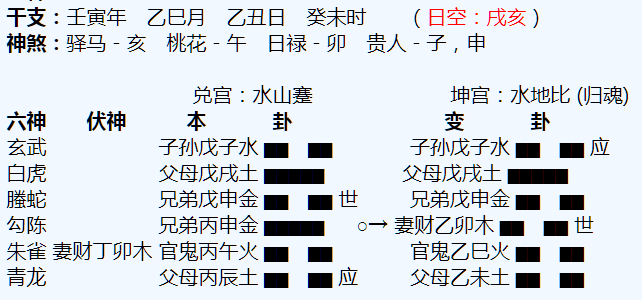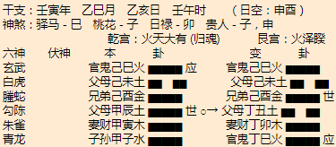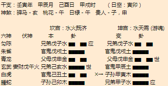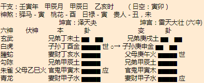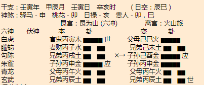 悟道分析:津市算命大师1、主卦大有,变卦火泽睽,形势严峻,一定要注意风险。2、子女星在子水宫,力量不旺,受到忌神辰土发动克制,这不是一个不太吉利的信号,古书上说,子女发动最忌神发动,一动子女就保不住...