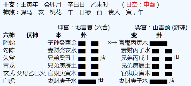 悟道分析:宁远算命大师一、命主的主卦为地雷复六合卦,变卦山雷颐,卦象有反复之意,也就是说一次性成功的概率比较低。二、命主的子女星临腾蛇发动,动化鬼星寅木,目前卯月,冲酉金,金的力量比较弱,鬼星寅木...