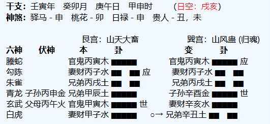悟道分析:郴州算命大师1、主卦山天大畜卦,变卦山风蛊卦,这个卦象不是工作变动的信号,是需要慢慢来,慢慢积累的卦象。2、命主财星发动入墓,也是需要按兵不动,等待时机的意思。郴州算命大师3、就是说如果命主...